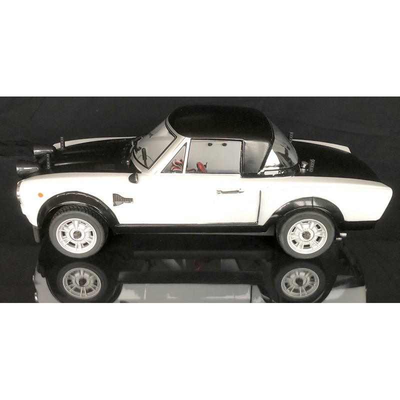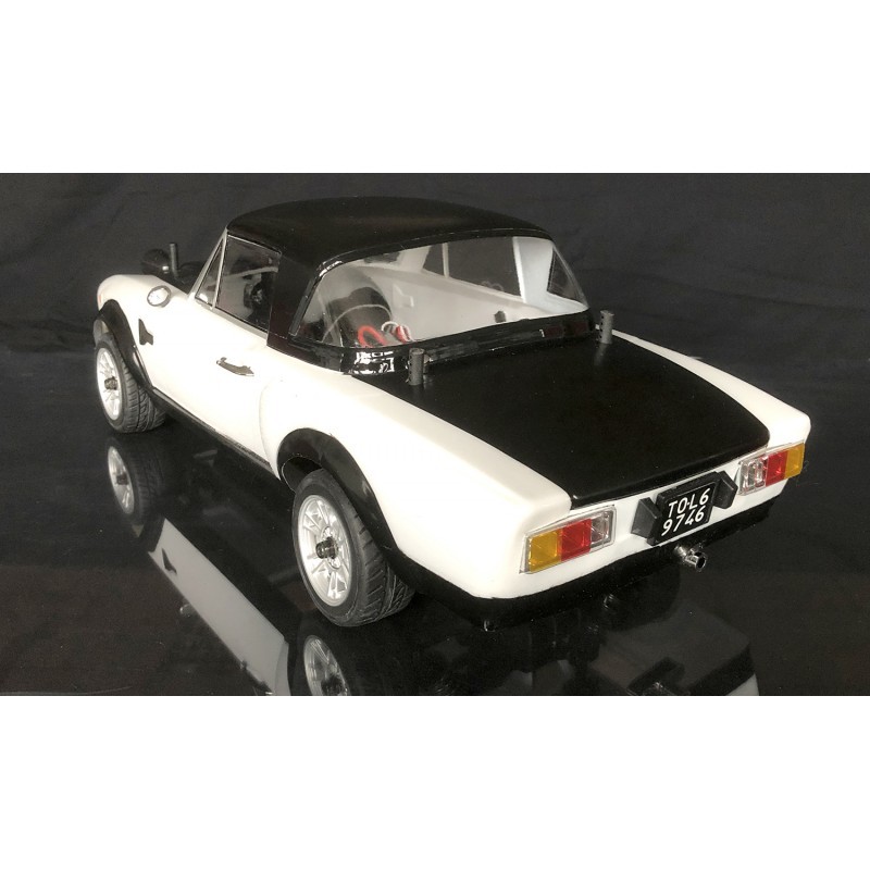 Amazing scale reproduction of the Fiat Abarth 124 rally, road version. Same dimensions and characteristics of all the other models of the series, same 4WD chassis, but with an aluminium CNC black anodized upper deck, and waterproof electronics. 6 Kg. steering servo.