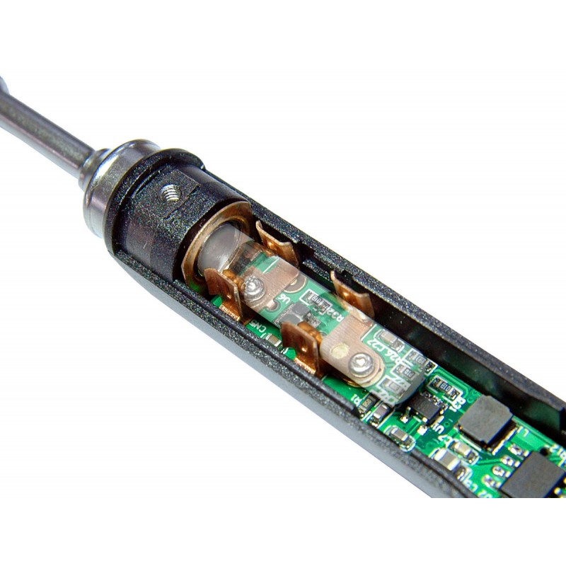 TS100 features stainless steel nested shell of Polycarbonate plastic. It is designed with safety circuit and anti-static structure, integrated with DC5525 12-24V port, dual-temperature sensors and accelerated sensors with STM32 chip. Under these functionalities, temperature can be controlled accurately, stably and easily adjusted from 100°C to 400°C, and the TS100 also has sleep mode and automatic over-heating warning.