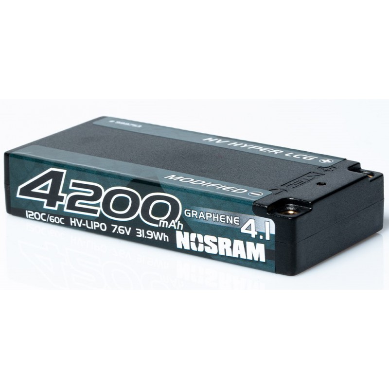 Nosram Graphene 4.1 Hyper LCG Shorty battery with 4200mah at 135 and 7.6V. Maximum power for all stock classes of "Blue is Better"!