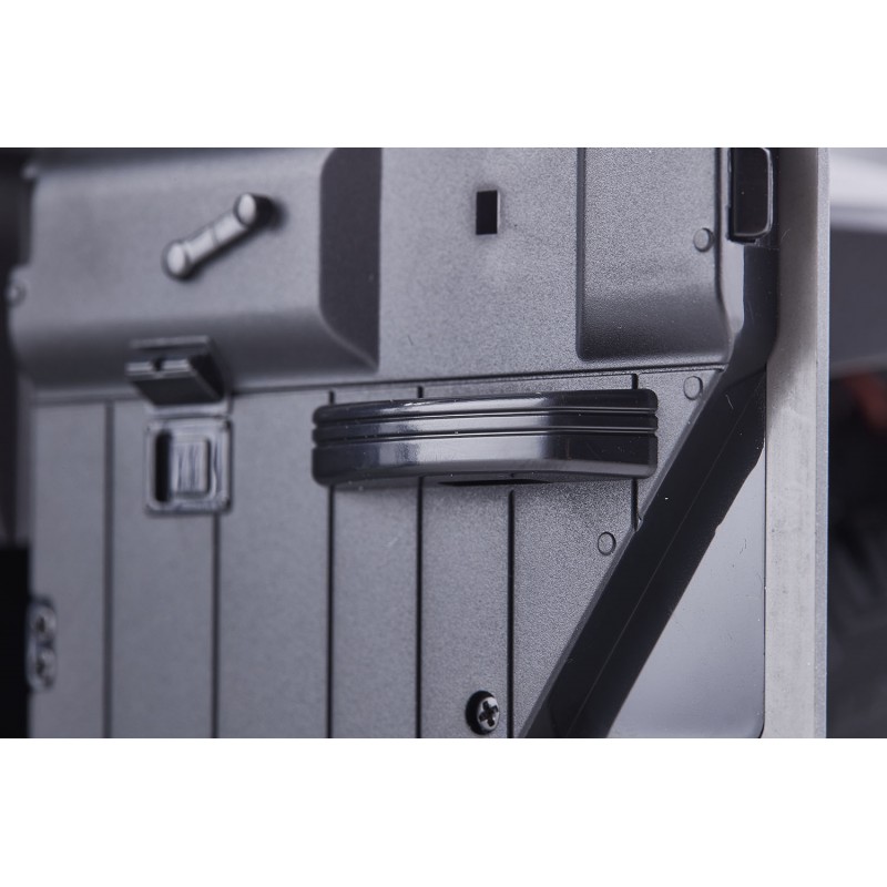 Power comes from a 370 motor. Two servos respectively control both the switch between high and low speed gears and the operation of the transfer case, thus switching between rear drive and four-wheel drive. Both the front and rear differentials also have a differential lock function, each driven by a servo which can be locked by remote control. Four metal drive shafts transmit power from the differential to the reduction gear assembly, commonly known as a "portal axle". The HUMMER H1 also has a full metal gear-set and 47 ball-bearings. We have included the rear wheel steering as an additional hidden function, so you now have a total of 4 steering modes! The extra mode, which can reduce the steering radius by 50%, is ideal in confined spaces.