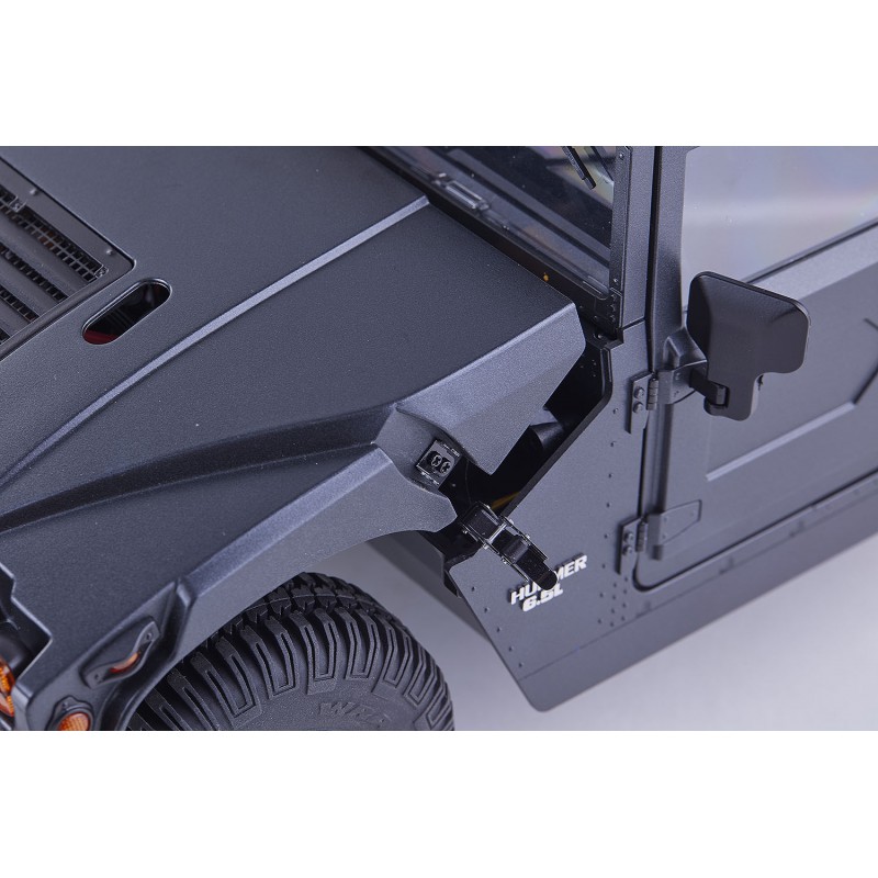 The HUMMER H1 uses a front mid-engine layout just like the real vehicle, and the hood is designed to be flipped forward. Four doors can all be opened, and the smart door lock mechanism is a separate unit. The cabin also features a highly detailed dashboard and moving steering wheel that turns with the main steering. The roof is removable and the windshield can be lowered forward. The body of the Hummer is mainly made of aluminum alloy and fiberglass, and the fixing method is riveting. A 2.4G 7CH digital proportional radio system, a receiver/ ESC/ light control three-in-one unit, 7 servos(including 13g metal gear servo x 2pcs)