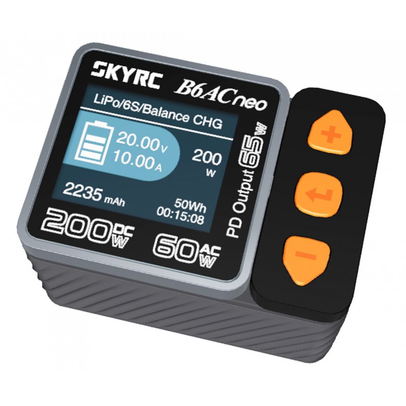 SkyRC's B6neo brings charging fun with its elegant two-tone design in grey. Whether on the track or in the hobby, it simply stands out from the crowd with the calm color scheme and shows the unique personality of the owner. The B6neo may be smaller than a credit card, but it's still extremely powerful. With a charging capacity of up to 200W (DC) and up to 80W with USB PD input, it sets completely new standards for comparable RC chargers. The elegant plastic housing with its attractive colors is a real eye-catcher!