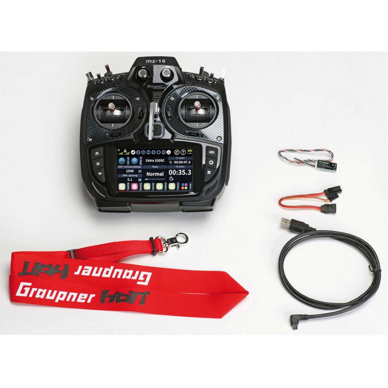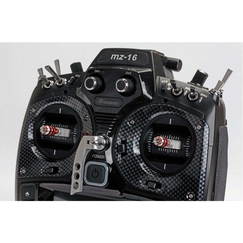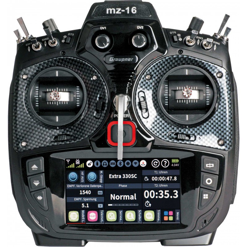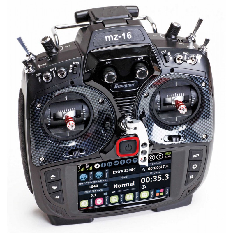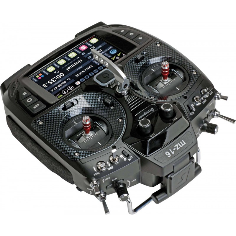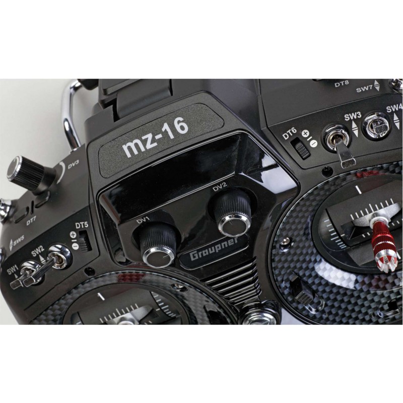 The Graupner mz-16 provides the technology and features only seen in high-end radios available as a 16 channel 2.4GHz HoTT radio. The mz-16 provides the pilot with a radio system where accuracy, control and reliability is fully integrated inside a high-tech carbon look and comfortable ergonomics transmitter.