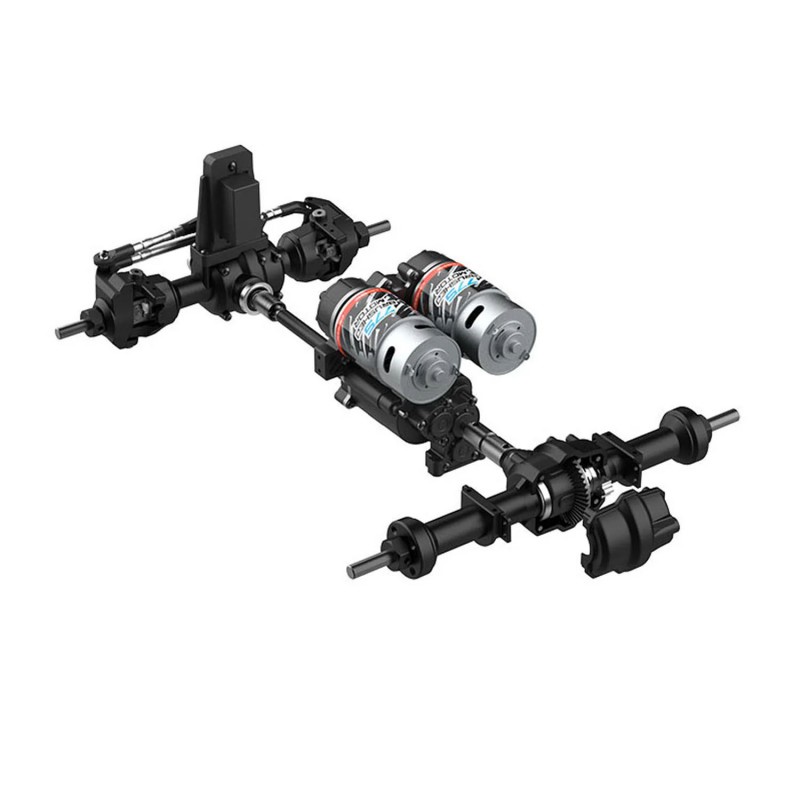 TL4 gearbox adopts special angle V-type dual 775 motors and dual 880 ESC, 2-speed all-metal gear set. The maximum can be modified dual 4274 motors, providing the car with large torque. Stout front and rear full-metal axles, 8mm output half-shafts, to meet the large torque output towing capacity.