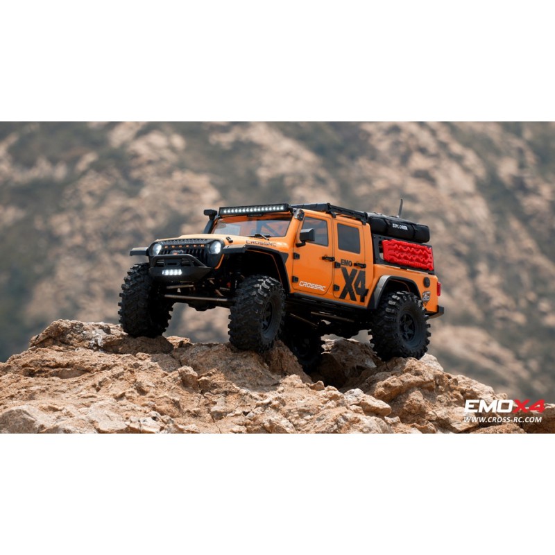 The all-new CROSSRC EMO X4 features a rugged off-road pickup truck design, a specially developed long wheelbase climbing chassis, and a separate design for the driver's cab and rear pocket based on the actual vehicle. It is equipped with nylon split wheel arches and a luggage rack kit in a cross over style, providing you with a very practical cross over modification style. The front and rear shells are installed independently, with a hidden quick release lock buckle on the front shell, equipped with a simulated interior and driver. The rear shell is fixed at the rear (battery and power system do not need to be removed), and the luggage rack is equipped with a simulated escape plate, spare fuel tank, and a dual sound effect small backpack speaker.