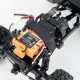 Upgraded metal chassis with oil-filled shocks, 4-link suspension, metal steering, ball bearings, and reinforced gears for maximum strength and crawling performance.