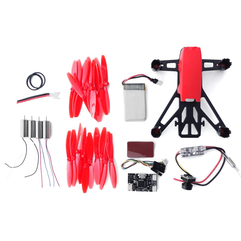 This mini FPV racer features a 100 mm diaginal size. The main frame is made of 3 mm thick durable plastic. The 65 mm props are poxered by 4 brushed 8.5 mm motors. The stability comes from a Naze 32 flight controller. The 1S 3,7 V 550 mAh LiPo battery offers a flight time of 7 minutes. The 600 TVL camera, the 5.8 GHz 25 mW 16 channels VTx are included. You only need to add your transmitter, your receiver and a LiPo charger.