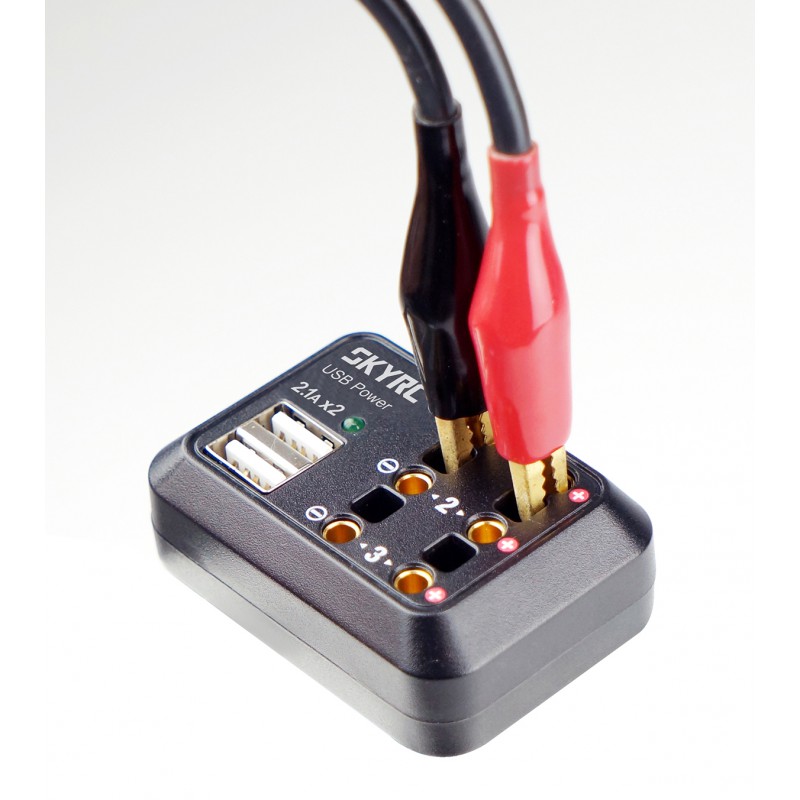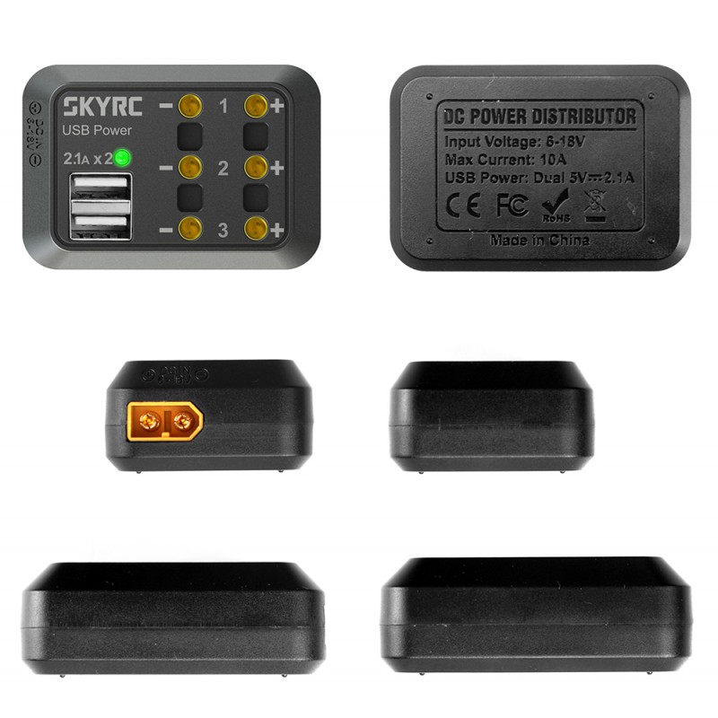 The world's smallest multi-port distributor from SkyRC features three DC output ports which support both banana connector and alligator clip. Two 5V/2.1A USB ports which support Smart phone and other devices.