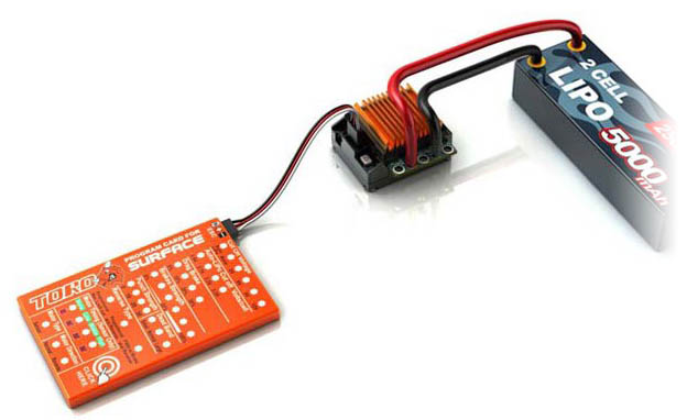 The programmation card allows to setup the ESC within seconds : Battery type, cut-off voltage, breaking power, punch and other settings are selected via LEDs and you just push a button to send parameters to the ESC. It can’t be more useful, intuitive and fast.