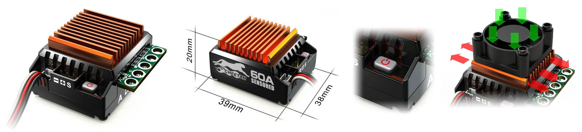 The Cheetah CS60 ESC is ultra-versatile : It can be powered by 5-9 cells NiMH batteries, but also bu 2S or 3S LiPo packs ! More, it may control sensored or sensorless brushless motors. Its built-in fan keep the ESC cool. A built-in push button to power on the ESC reduce the wires in the car. And last, you will supress the Rx battery, the built-in BEC offers 6V and 3A to power the receiver and the steering servo.