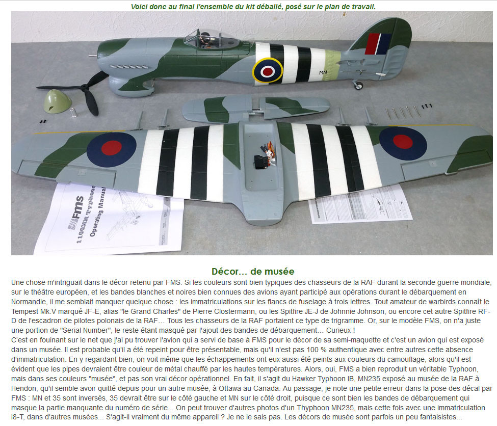Jean-Louis Coussot, former editor-in-chief of model aircraft magazines such as Looping and FLY International, has just published a new FMS aircraft review on his website. This time it is the Hawker Typhoon 1100 mm that he studies down to the smallest detail. If it is not a novelty, as he states, this aircraft is one of the great standards of the brand and it continues its career without aging.