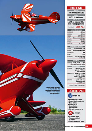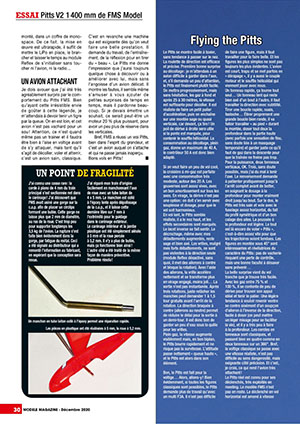 The V2 version of the FMS 1400mm Pitts is reviewed for Model Magazine by Jean-Louis Coussot, who details this aircraft which has entered the legend of aerobatic aircraft history. No less than 8 pages are devoted to it. And we heard that a sequel is planned, with beyond the test, some cosmetic enhancements easy to achieve ... We look forward to this second part!