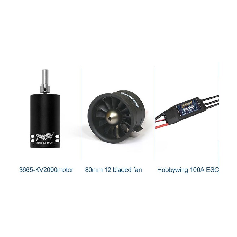 1. Motorisation : Contrôleur Hobbywing 100A, Moteur 3665-KV2000, turbine à 12 pales de 80 mm.