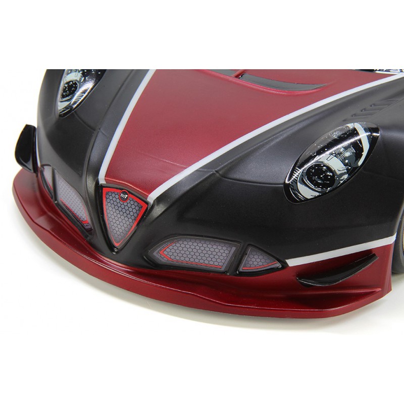 La carrosserie, fabriquée en polycarbonate de haute qualité, comprend des vis de fixation pour l'aileron arrière, des autocollants pour les phares et les bas de caisse ainsi que des caches pour protéger les vitres.