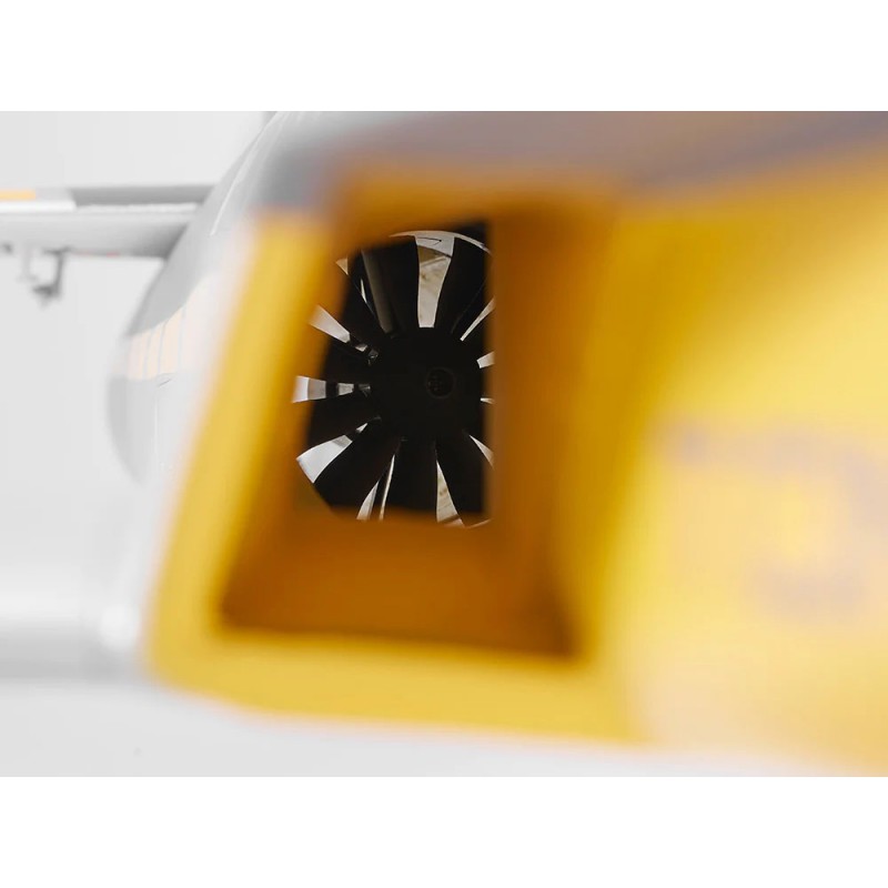 Le Futura est assurément une agréable surprise pour ceux qui restent hésitants entre choisir un jet de vitesse et un jet de voltige. Il offre des vitesses élevées, une grande maniabilité et d’excellentes qualités de vol, à la grande satisfaction de pilotes souhaitant profiter de styles de vol variés comme du vol en toute liberté, l’entraînement à la compétition et la voltige. L’ensemble de propulsion se compose d’un moteur brushless à fort couple 2840-kv3150, d’un contrôleur 40A à haute stabilité et d’une batterie LiPo 4S de 2200 à 2600 mAh (vendue à part), ce qui, couplé à 8 servos 9 grammes de haute précision installés dans les ailes, les empennages et pour diriger la roue avant, permet au pilote de s’essayer à diverses techniques de pilotage et de profiter du plaisir du vol à grande vitesse. De plus, les ailes et les empennages du Futura ont été pré-équipés de bandes de renfort, et la cabine est fermement tenue en place par un verrou, ce qui permet de réaliser des virages serrés, des tonneaux et des flips sans inquiétude. Le train métallique usiné CNC, à roues tirées, est extrêmement précis et robuste, protégeant l’avion des atterrissages durs.