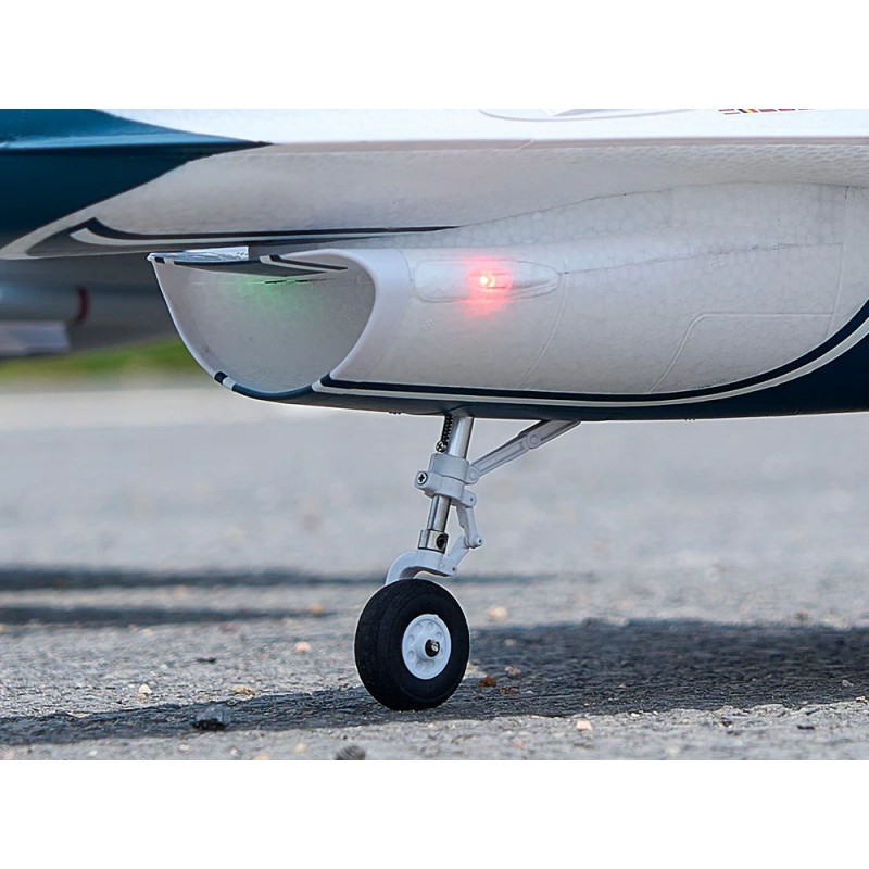 Le nouveau F-16 64mm issu de nouveaux moules ne se contente pas de dimensions plus importantes, et de détails plus précis, il améliore aussi sensiblement le réalisme. Les éléments du train avant sont usinés CNC avec des habillages en plastique, offrant un haut niveau de réalisme et une excellente absorption des chocs. Le train principal est fait de tiges en acier habillées de plastique, augmentant le réalisme sans compromettre la robustesse. Les feux de navigation ont été ajoutés sur les ailes, les empennages et dans l’entrée d’air pour améliorer l’ambiance en vol. Ils sont soigneusement conçus pour respecter les effets lumineux de l’avion réel, offrant une allure plus authentique en conditions de faible lumière. En plus du contrôle des ailerons, de la profondeur et de la roulette de nez, la commande du gouvernail de direction a été ajoutée, améliorant notablement la maniabilité de l’avion et autorisant la reproduction fidèle des figures typiques de la plupart des chasseurs. Le fuselage, les ailes et les empennages sont dotés de tubes de renfort intégrés pour éviter toute déformation lors de figures agressives. Le décor gris de combat et le décor des Thunderbirds sont les deux options disponibles. La version grise est livrée avec des réservoirs et missiles réalistes et comprend 5 jeux différents de stickers afin que le pilote puisse choisir selon ses préférences.