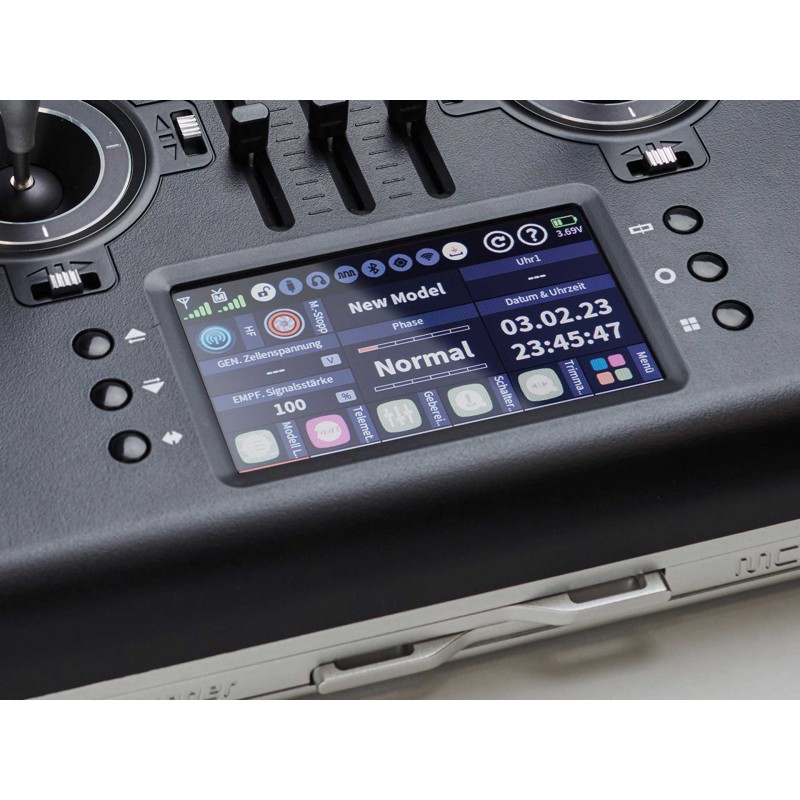Les manches à quatre roulements à billes, avec une résolution de capteur à effet Hall de 2400 pas (équivalent à un changement d'impulsion servo de 0,5us), offrent une sensation de contrôle pur sur votre modèle. Les commutateurs à 3 niveaux intégrés permettent de commuter facilement les phases (niveaux), le moteur, l'autotrim ou d'autres fonctions définies par l'utilisateur. Les unités de puissance peuvent également résister aux mauvaises conditions météorologiques et sont facilement accessibles depuis l'arrière de l'émetteur pour les régler selon vos préférences. L'émetteur peut également être équipé de sticks 4D. Cependant, l'un des deux encodeurs 4D est alors connecté à la place de l'encodeur cylindrique supérieur de l'émetteur, qui peut être connecté à n'importe quel autre emplacement libre.