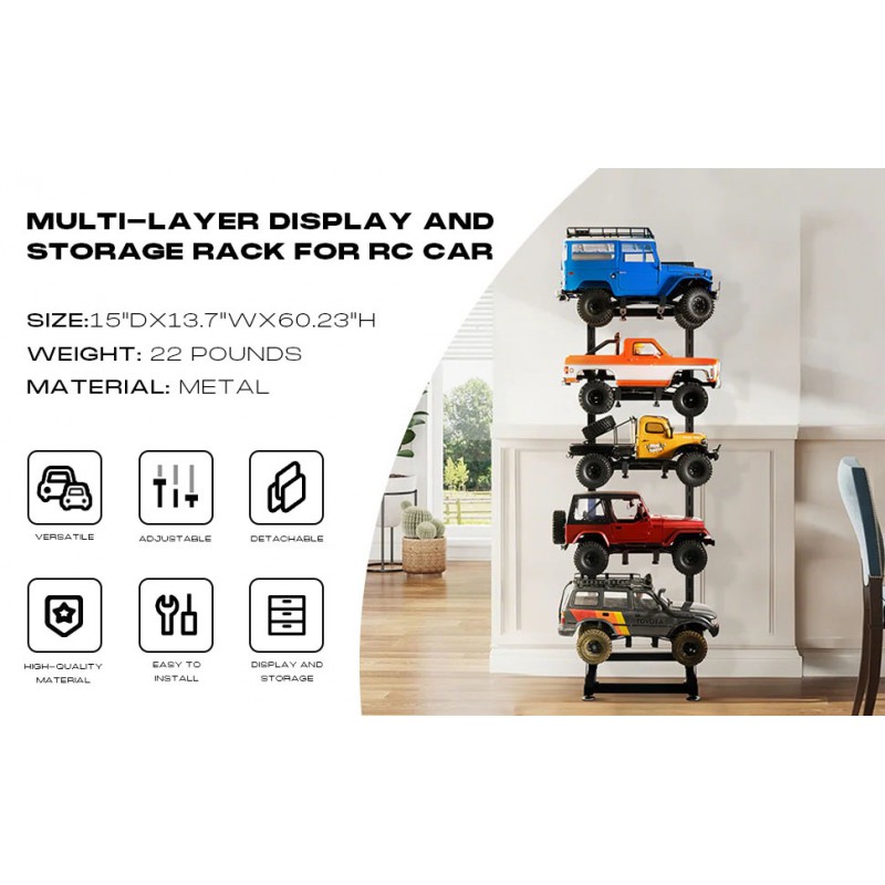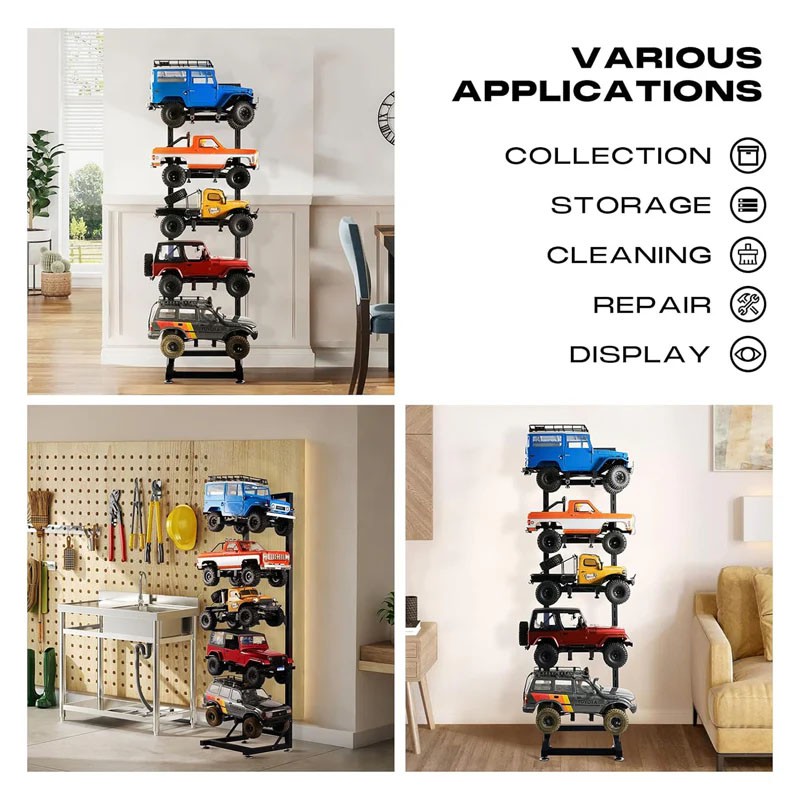 Sa conception multicouche flexible et modulable permet d'ajuster facilement la hauteur et la capacité pour répondre à divers besoins de rangement. Le support est compatible avec les voitures RC aux échelles 1/6, 1/10, 1/12, 1/18, 1/24, 1/32, etc., ce qui en fait un support multifonctionnel indispensable et économique pour les passionnés.