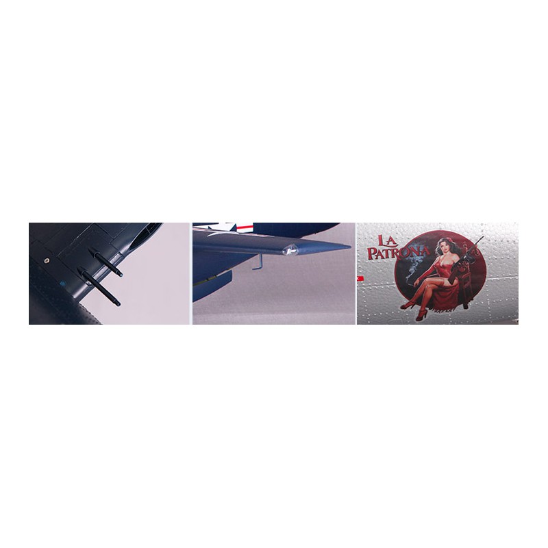Le Tigercat offre une apparence maquette, avec de nombreuses pièces moulées en plastique, comme les trappes de train, les capots, les faux moteurs et les canons. Ajoutez à cela les rivets reproduits en détail, les lignes de structure, le buste de pilote, les éclairages à LED à haute intensité, au train suspendu usiné CNC… Le Tigercat est reproduit sans concession ! La version bleue est livrée avec 4 jeux de décalcomanies qui permettent de décorer votre Tigercat selon vos préférences. Pour la version argent, un seul décor est proposé.