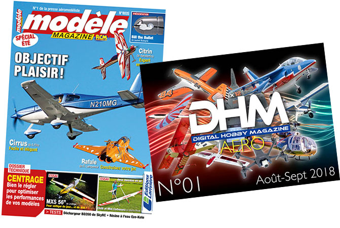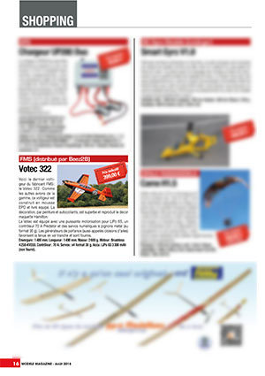 La publicité du mois se partage entre les nouveautés FMS, Votec 322 de voltige et trainer polyvalent Kingfisher, et celles de SkyRC, e40 pour les drones et B6 Nano, minuscule puissant à la fois, à emmener partout.