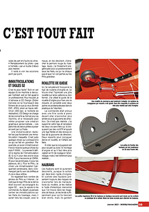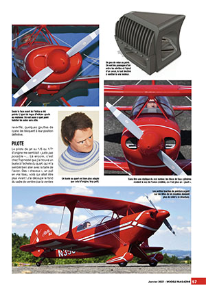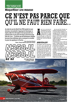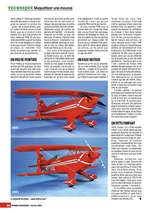 Une suite à l'essai du Pitts V2 de FMS est publiée dans ce numéro de Janvier. Visiblement séduit par l'avion, Jean-Louis Coussot a décidé d'y ajouter des détails, d'apporter quelques modifications et d'améliore le décor afin de le rendre plus "vivant". Nous aimons beaucoup la devise de cet article, qui peut s'appliquer à une majorité de modèles dits prêts à voler :