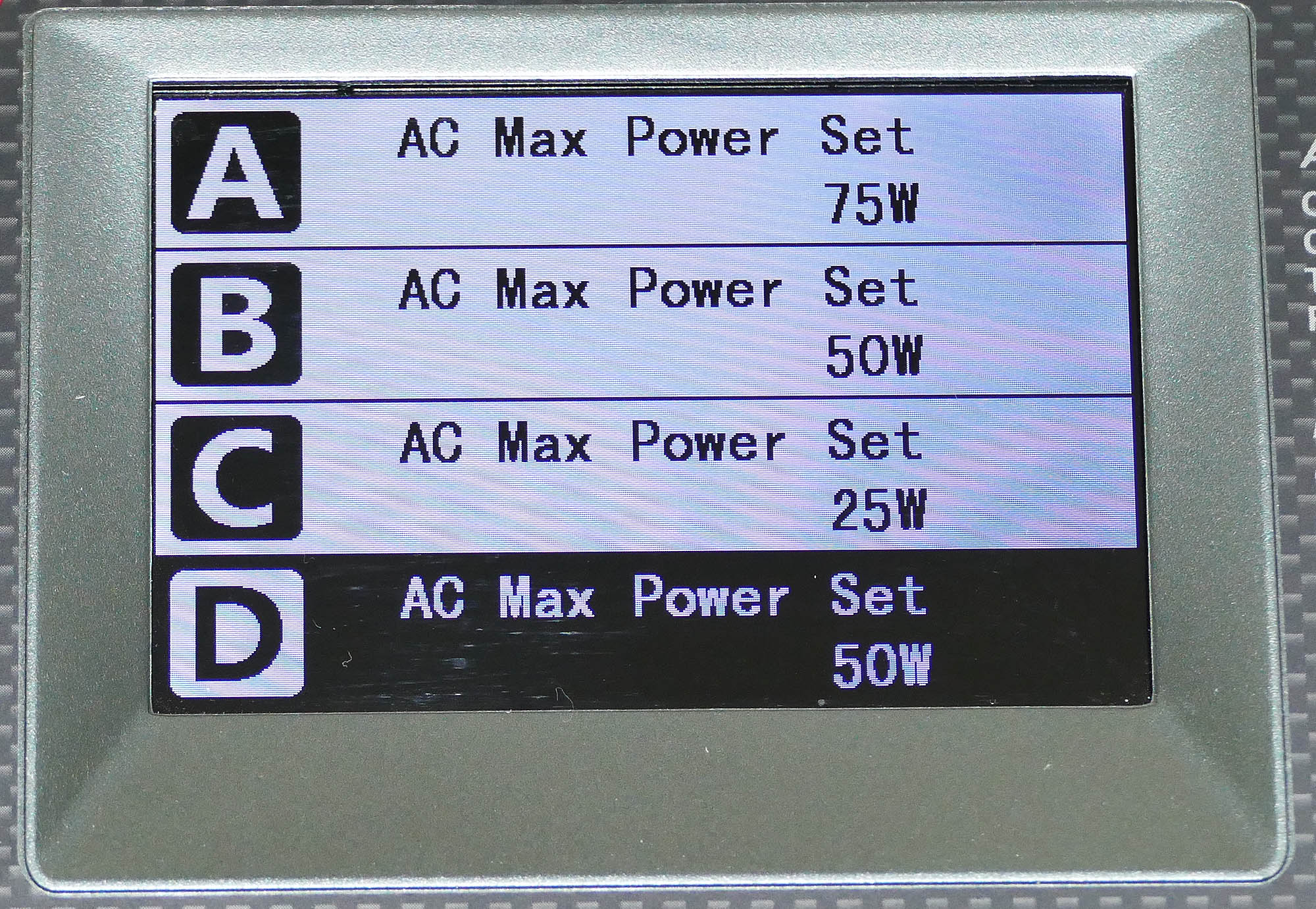 Quand le Q200 est alimenté sur secteur, vous devez définir une répartition de la puissance : Par défaut, seuls les canaux A et B peuvent assurer une charge, à raison de 100 Watts sur chaque canal. Mais vous pouvez gérer la distribution de puissance en donnant une partie de la puissance du canal A au canal C, et une partie de la puissance du canal B au canal D. Ainsi, vous pouvez par exemple avoir 50 W sur le canal A et 50 W sur le canal C (soit 100 W au total pour A et C), et 70 W sur le canal B, mettant ainsi 30 W à disposition du canal D (et donc on a là aussi 100 W pour l'ensemble B+D). Il est important de bien assimiler cette fonction de répartition de la puissance afin de tirer le meilleur du chargeur, surtout quand on doit charger des packs très différents les uns des autres sur les divers canaux. Les plus "gros" packs seront plutôt connectés aux canaux A et B, les plus petits aux canaux C et D.