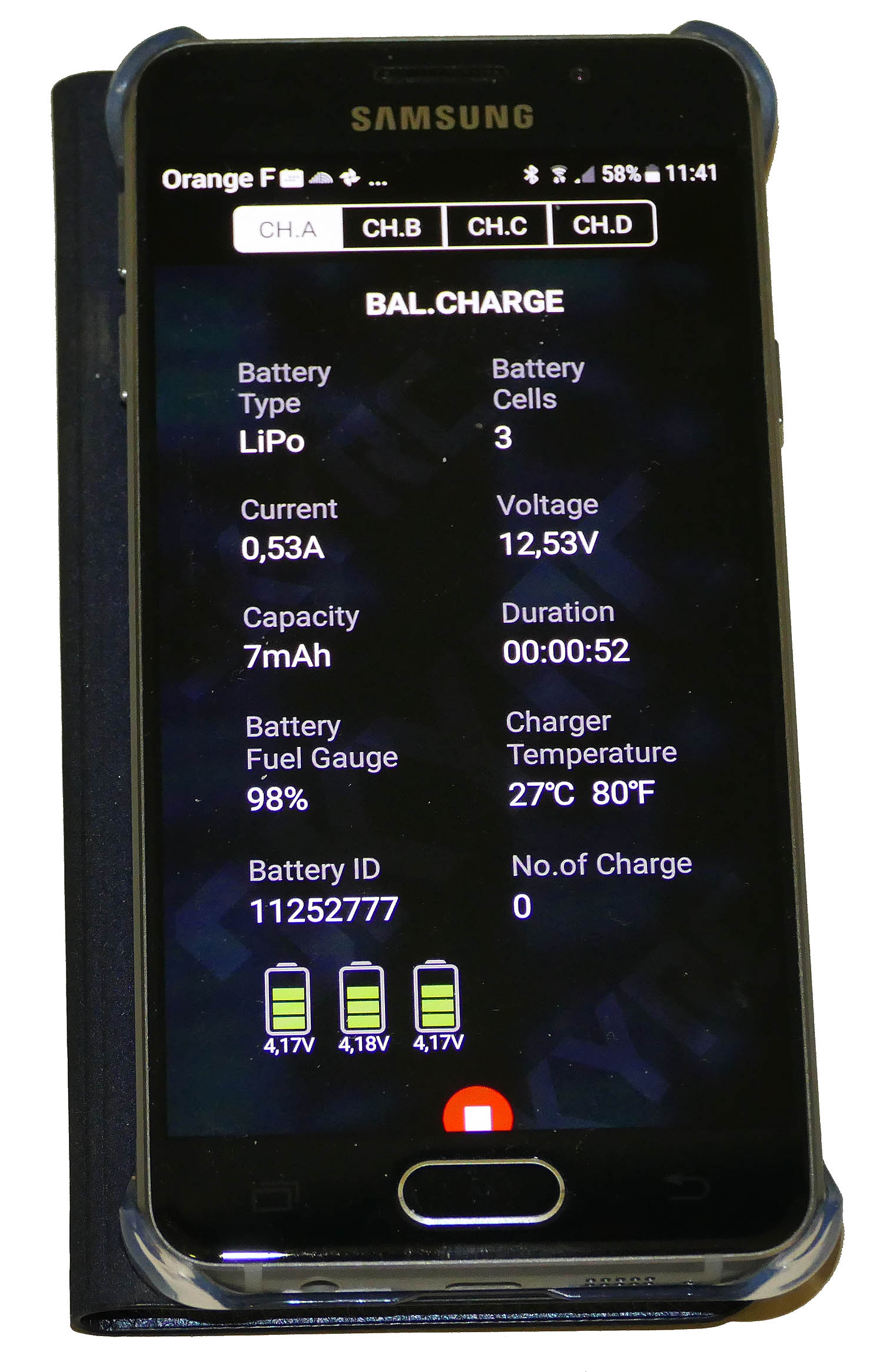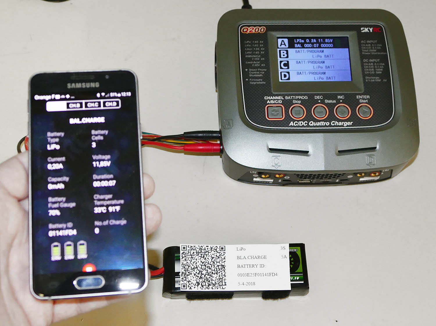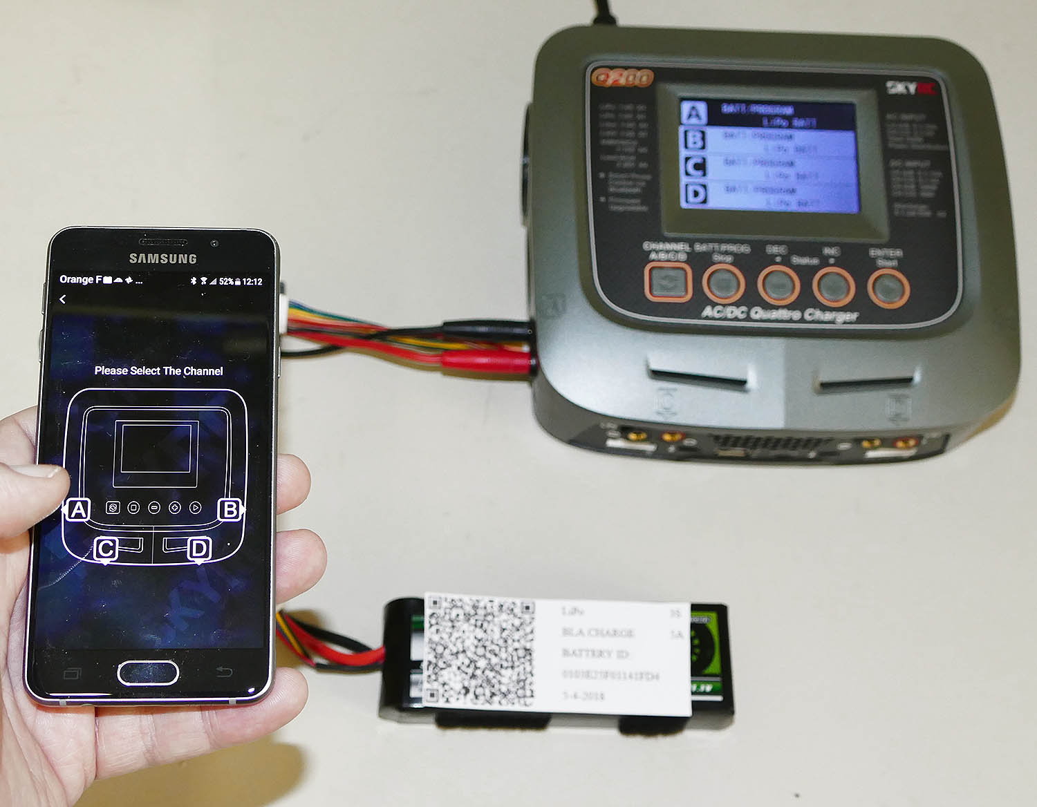 Le Q200 dispose d'une connectivité sans fil utilisant le protocole sans fil "Bluetooth 4.0". Une application "SkyCharger" est disponible gratuitement pour iOS (8.0 ou supérieur) et Android (4.1.2 ou supérieur), qui permet de piloter et de surveiller les quatre canaux du Q200 directement depuis son smartphone. Bien sûr, il faut toujours être devant le chargeur pour connecter les packs… et donc, l'intérêt de paramétrer depuis le smartphone plutôt que depuis le clavier et l'écran du chargeur reste très relatif. Par contre, une fois le processus lancé, vous pouvez vaquer à des occupations restant à portée de Bluetooth et garder aisément un œil sur les processus en cours depuis votre mobile, et là, c'est vraiment pratique !