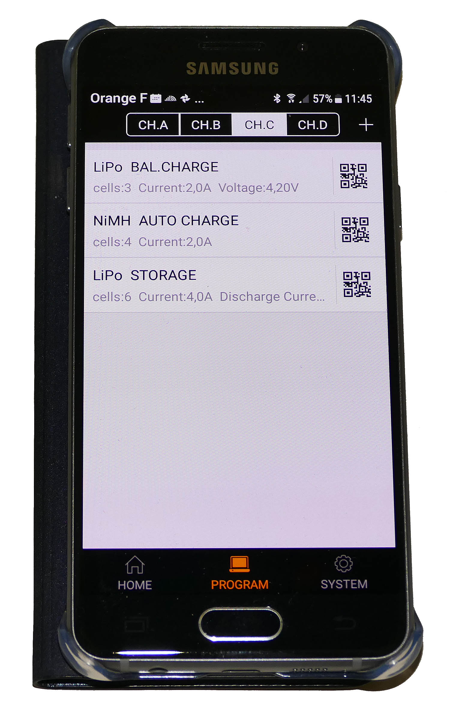 A gauche, les paramètres "système" du Q200 sont visibles sur une page unique quand on les paramètre depuis l'application SkyCharger. A droite, pour chaque canal, on peut créer des "programmes" correspondant à un type de pack et à un mode donné. Cela permet de lancer un processus préétabli en un instant.