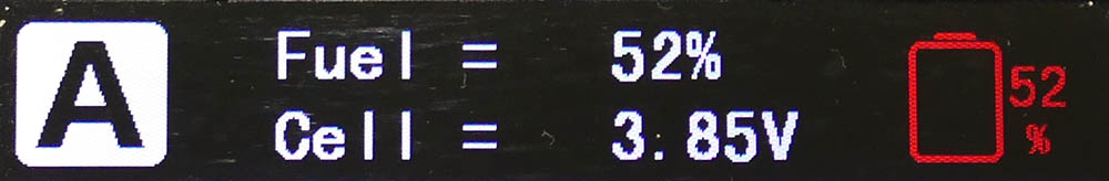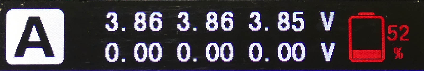 Un appui sur "INC" et on peut lire la tension de chaque élément du pack. A droite, la jauge nous indique le pourcentage de capacité restant dans l'accu (52 %).