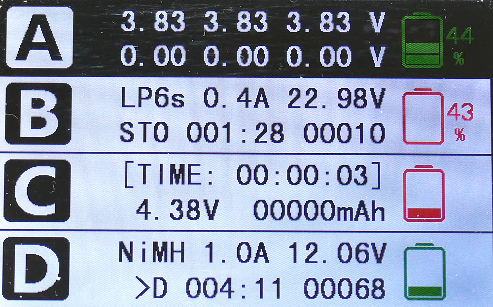 A gauche, à la mise sous tension, cet avertissement est affiché systématiquement. A droite, l'affichage quand les quatre canaux sont au travail. La ligne sur fond noir indique le canal qui sera affecté si on appuie sur une touche. On est en lecture des tensions de chaque élément du canal A qui charge, un LiPo 6S est en mise en condition pour le stockage sur le canal B, il est en décharge. Le canal C a terminé un processus de décharge et le canal D est en mode "cyclage" et en train de charger un pack NiMH. Avouez que c'est limpide !