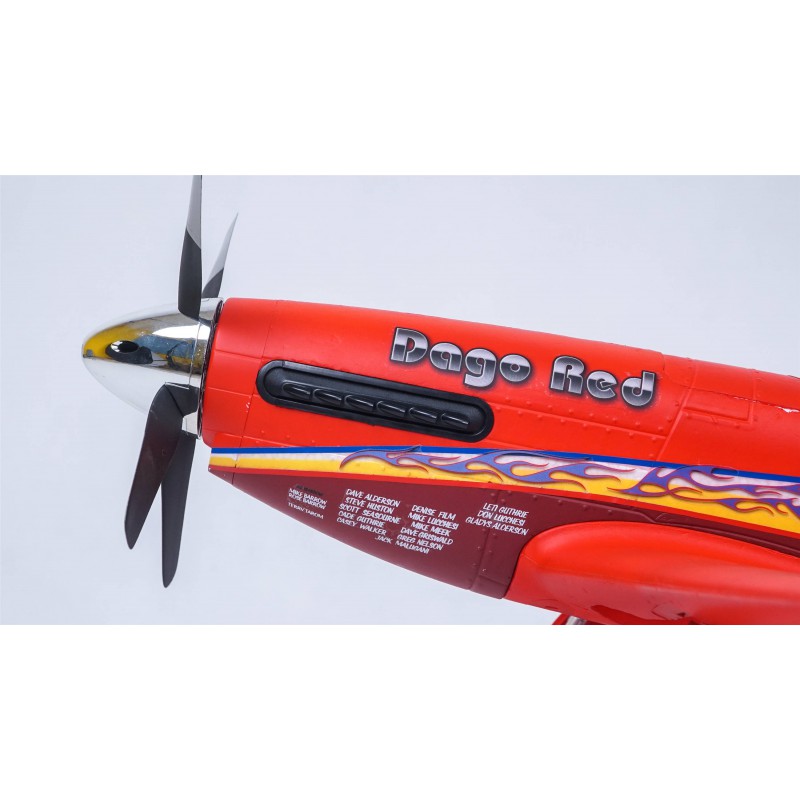 Scale detailing and upgraded electronics are impeccably integrated: the FMS 1100mm Dago Red features a realistic four-bladed propeller, forward tilting landing gear, functional flaps, scale cockpit, engine exhausts, air intake, wing fences and antenna.