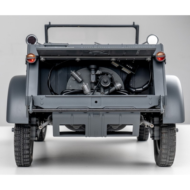 The armrest in front of the rear seats has four clips in the middle that fit into holes in the floor to hold four 98K rifles which were produced by the Mauser Arsenal in Oberndorf and needed to be purchased separately for 70 Reichsmark each at the 1939 exchange rate. The rear seatbacks can be lowered for easy access to supplies from the trunk. Great effort has been made to optimize the layout of the electronics to prevent the battery or receiver from taking up space in the trunk. The trunk height of the Typ82 was designed to accommodate 20L oil (water) Jerry can or to store weapons, ammunition, and food supplies. All these features are properly restored to make the user experience more fun, but of course these supplies, like the 98K have to be purchased separately.