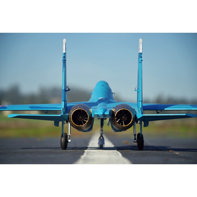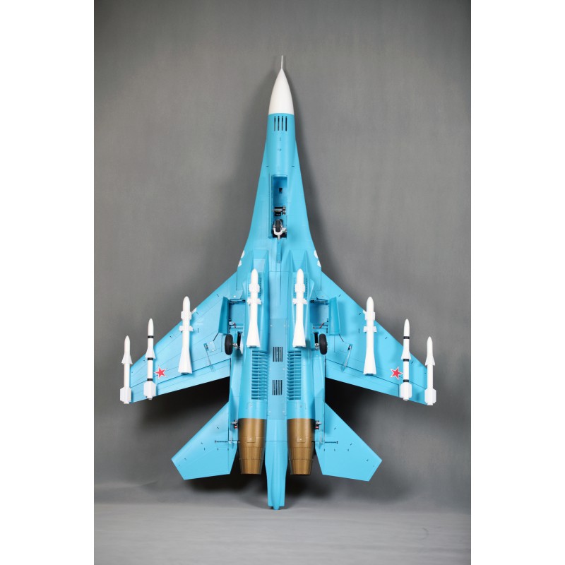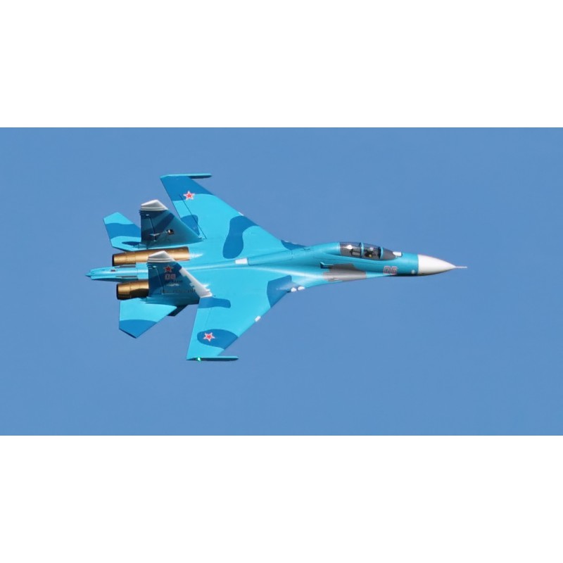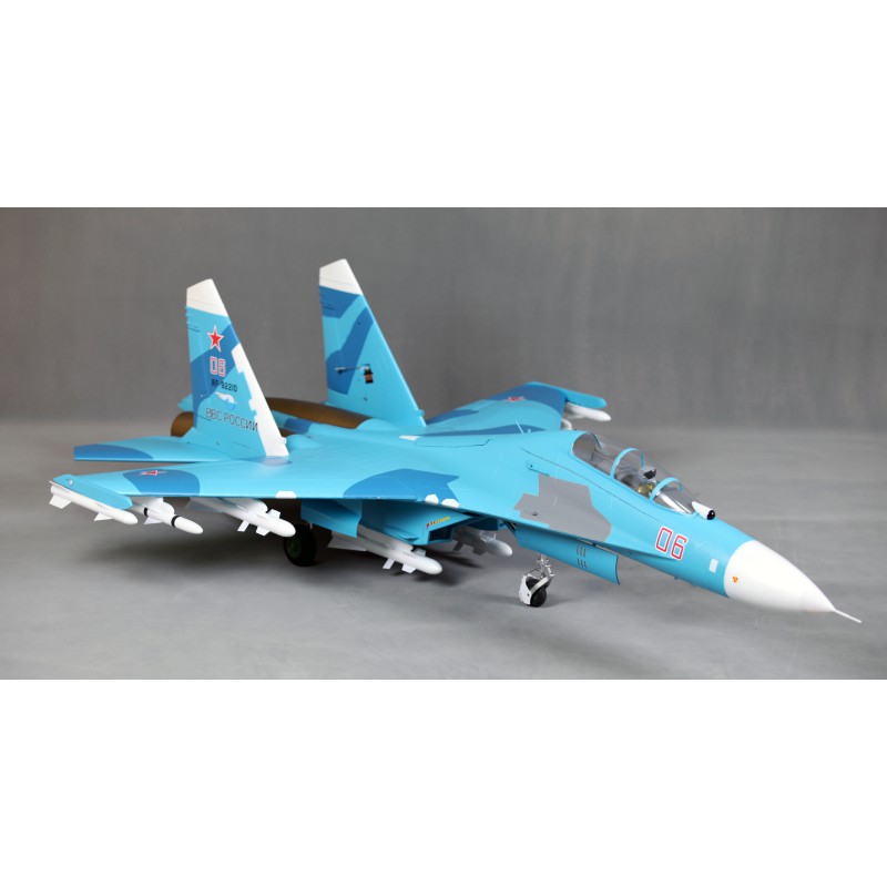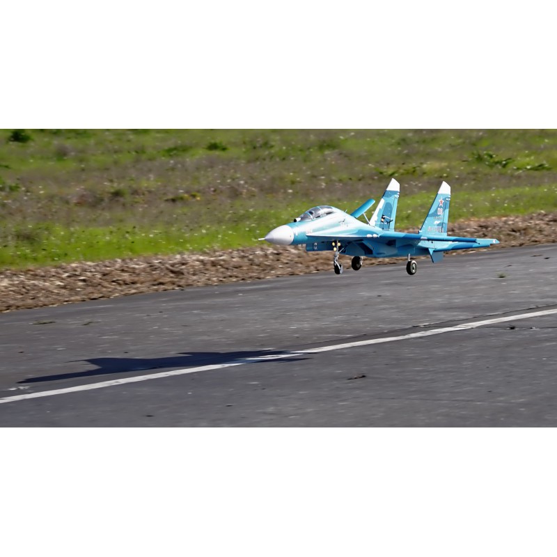 "Static" refers to the level of quality of the reproduction. FMS has captured the essence of this fighter. A reproduction of the functionality, with the large airbrake, navigation and landing lights, fully movable horizontal tailplanes, gear doors with sequencer, the landing gear assembly that withstands hard landings, and also a reproduction of the details such as the cabin, structural lines, removable weapons, pilot and easily recognisable scenery. All these details combine to make the Su-27 stand out both on the car park and in flight.