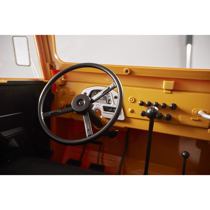 This 1/10 remote control climbing vehicle FJ40 presented by FMS uses an ABS hard body to accurately restore the shape and details of the real vehicle. The left and right doors can be opened, and the door hinge adopts the same metal hinge structure as the real car. The roof can be removed and transformed into a compact pick-up. The hood can be opened, and hidden below are the 35T 550 motor, high-quality brushed ESC and receiver.