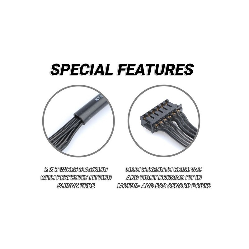 Nicely packaged 3 wire strands next to each other and stacked in 2 rows on top of each other, perfectly positioned with a shrink tube, which is not too tight and not too loose with further improved crimping and a tight fit to motor- and ESC sensor ports.