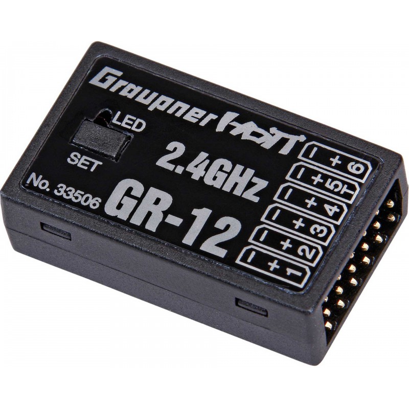 The GR-12 provides real-time bi-directional data transmission of critical system health data like temperatures, receiver voltage and signal strength using the Graupner HoTT protocol providing you with telemetry information you need for a safe and secure flight. The built-in program mixers allow increased flexibility in flight precision and function.
