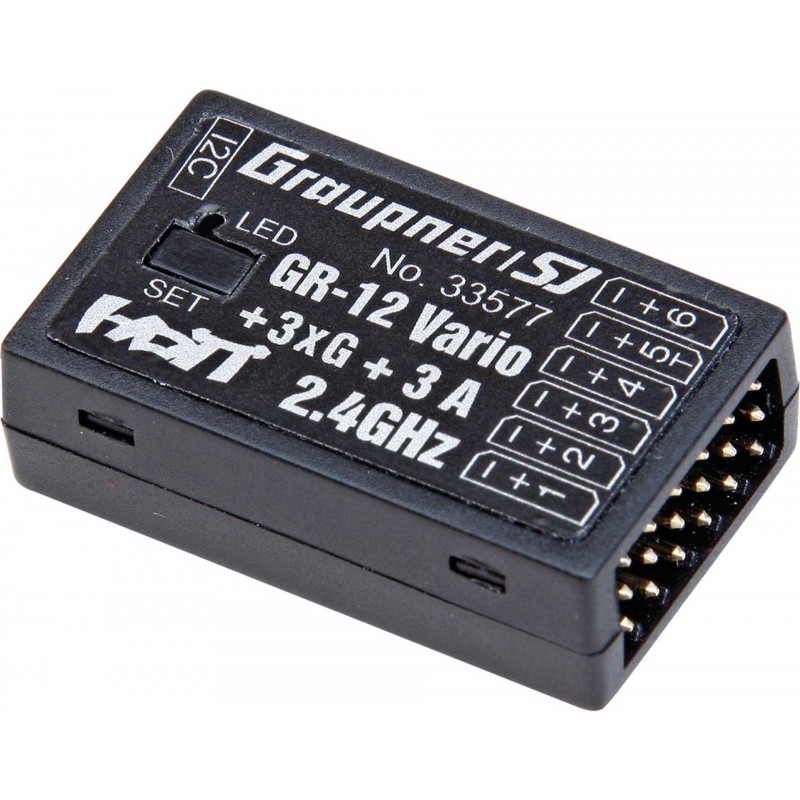 The Graupner GR-12 +3xG +Vario HoTT receiver can be assigned up to 6 channels and has an integrated 3-axis gyro system (gyro), a 3-axis acceleration sensor (A-meter) and an integrated variometer. The 3-axis gyro ensures stability, even in poor wind conditions. Proportional gyro suppression ensures natural flight behavior. Thanks to the 3-axis gyro, even the most difficult flight maneuvers can be performed smoothly and cleanly. The gyro assignment and all parameters can be easily set via HoTT telemetry.