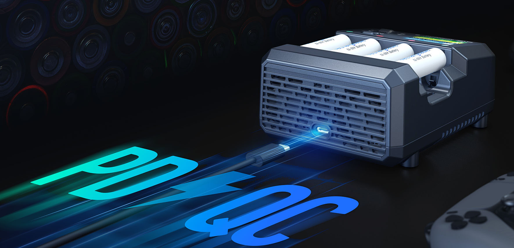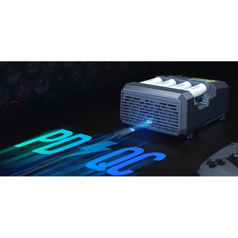 Il supporte les entrées QC2.0 et QC/PD 3.0, et avec ses quatre baies indépendantes, le NC3000 Pro peut charger simultanément jusqu'à quatre batteries.