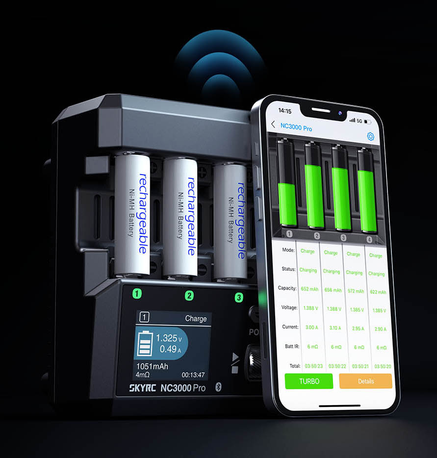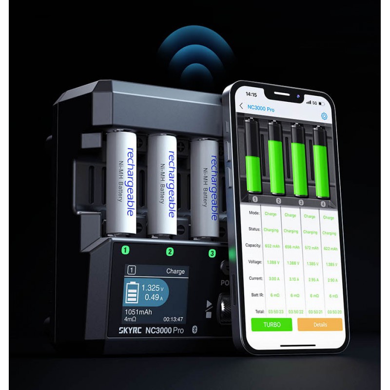 En plus, le NC3000 Pro offre le Bluetooth intégré, permettant à l'utilisateur de gérer les batteries et d'analyser facilement les données via l'application SkyCharger.