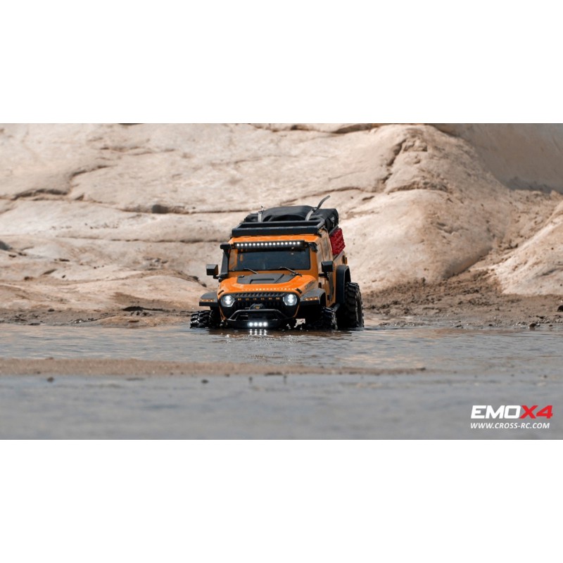 The all-new CROSSRC EMO X4 features a rugged off-road pickup truck design, a specially developed long wheelbase climbing chassis, and a separate design for the driver's cab and rear pocket based on the actual vehicle. It is equipped with nylon split wheel arches and a luggage rack kit in a cross over style, providing you with a very practical cross over modification style. The front and rear shells are installed independently, with a hidden quick release lock buckle on the front shell, equipped with a simulated interior and driver. The rear shell is fixed at the rear (battery and power system do not need to be removed), and the luggage rack is equipped with a simulated escape plate, spare fuel tank, and a dual sound effect small backpack speaker.