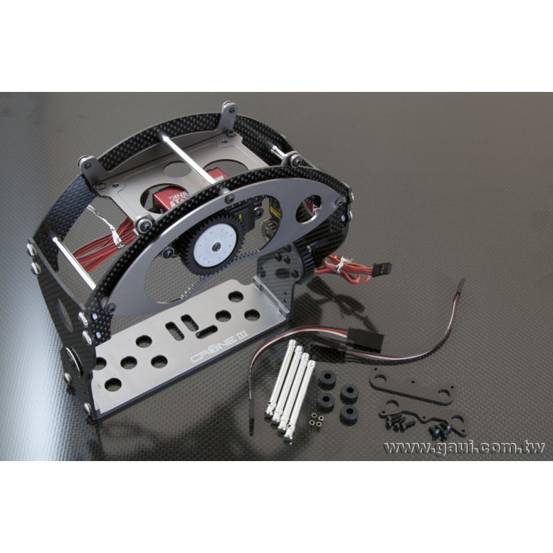 This high quality guimbal is made by GAUI and is reliable, lightweight, and made of carbon and aluminium. The Crane III is able to fit different cameras.
