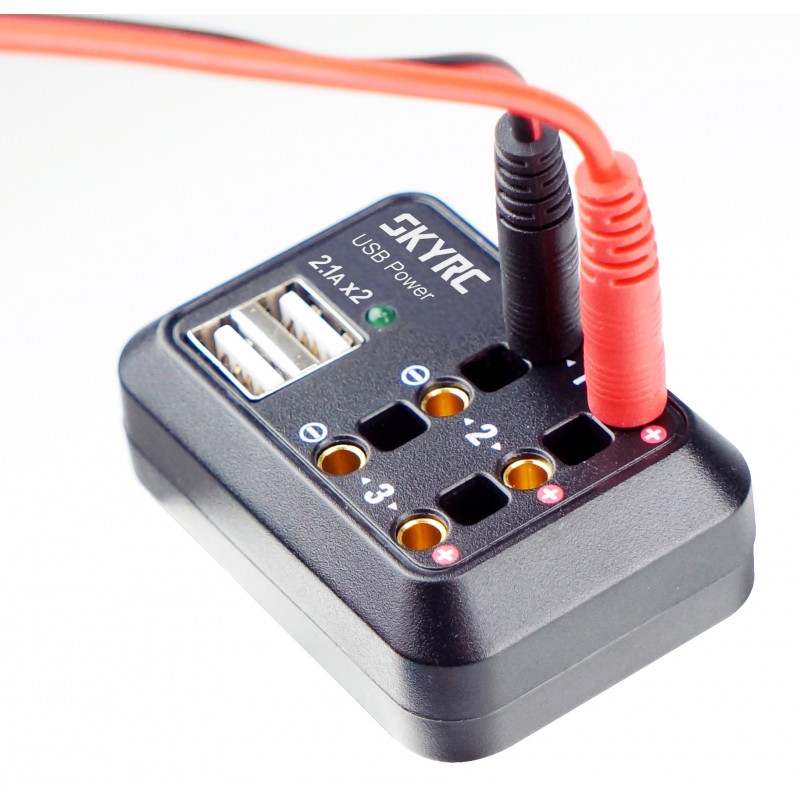 The world's smallest multi-port distributor from SkyRC features three DC output ports which support both banana connector and alligator clip. Two 5V/2.1A USB ports which support Smart phone and other devices.