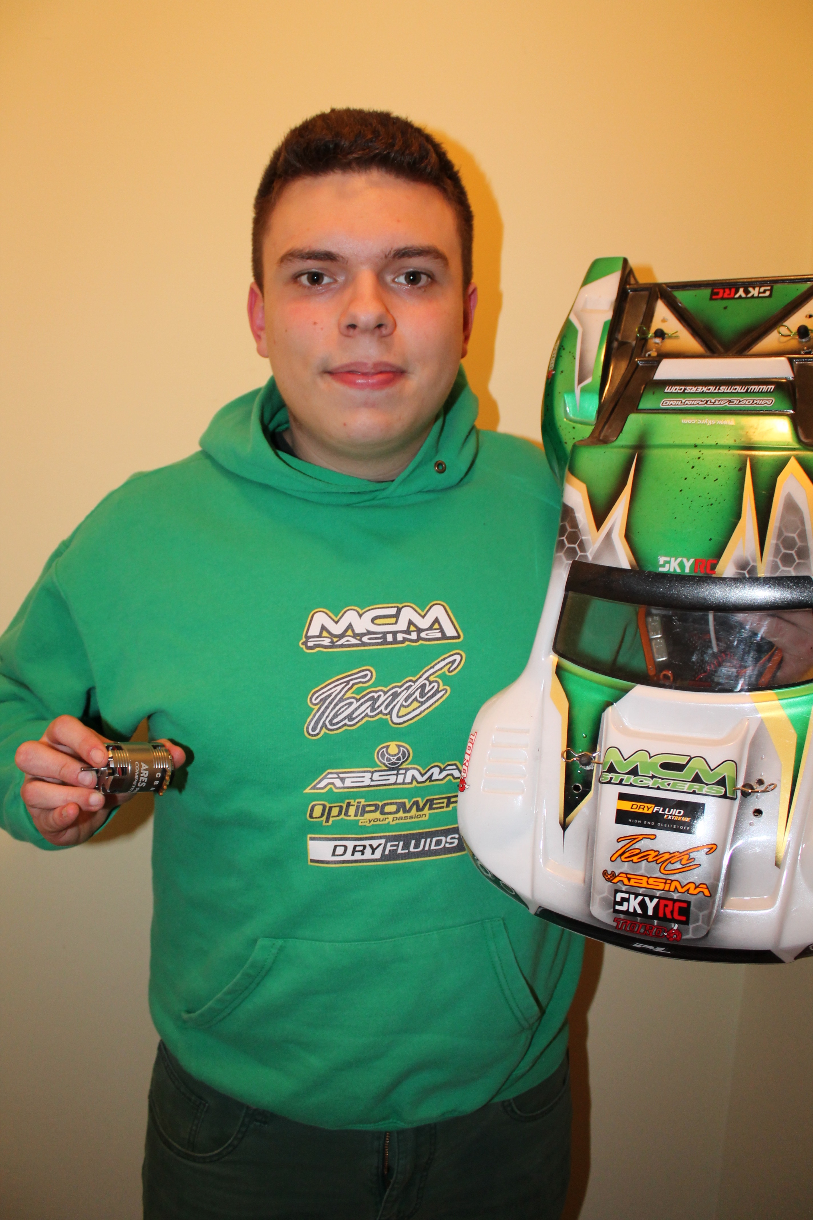 Fabio CUMPS gebruikt een combo van SKYRC bestaande uit een TS120 ESC black aluminium case en een 7,5 Ares Pro motor. Heel blij met zijn nieuwe materiaal behaalde hij een podiumplaats bij de eerste race at his first race van het Euro Indoor Race in Charleroi.