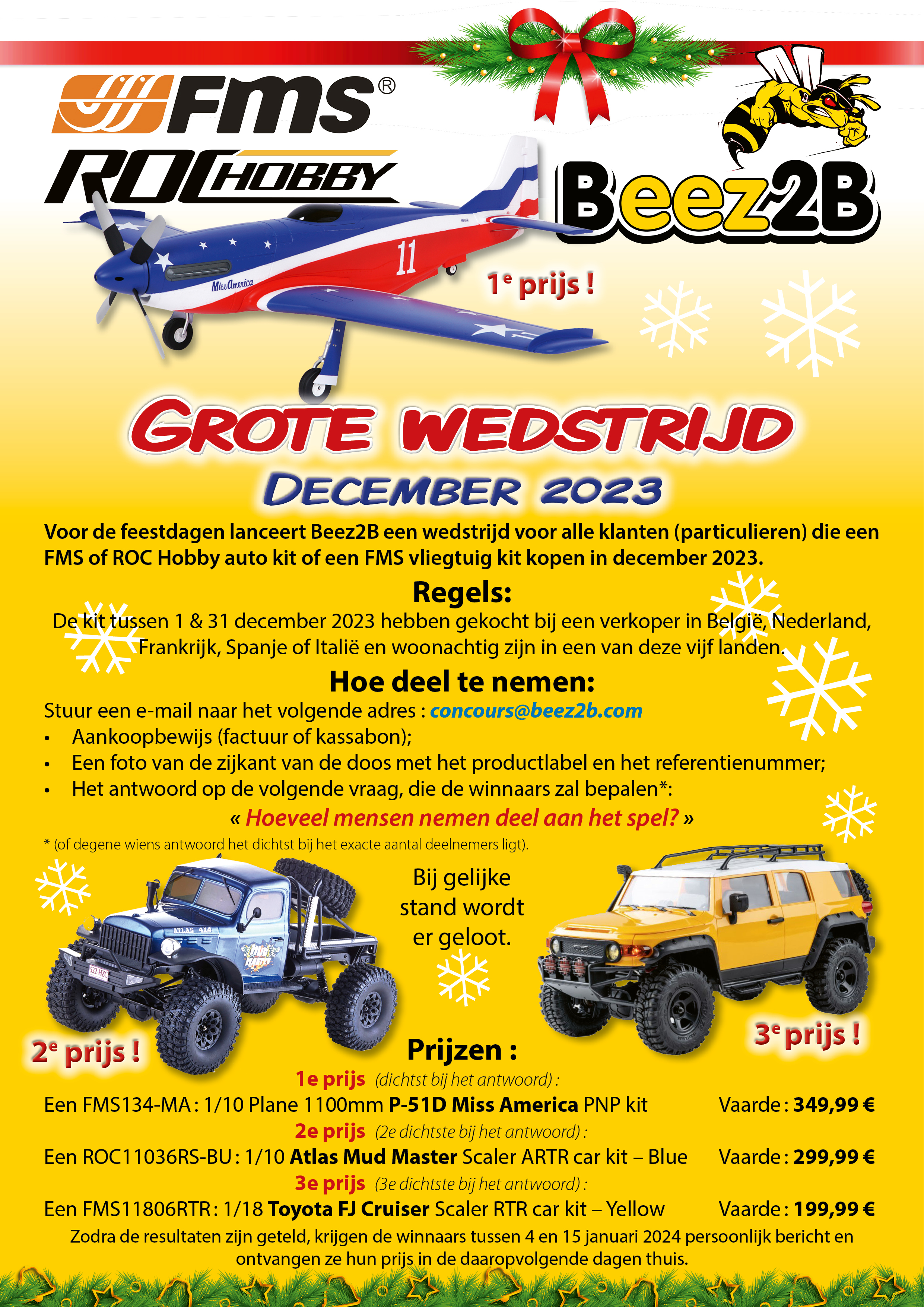 Voor de feestdagen lanceert Beez2B een wedstrijd voor alle klanten (particulieren) die een FMS of ROC Hobby auto kit of een FMS vliegtuig kit kopen in december 2023.