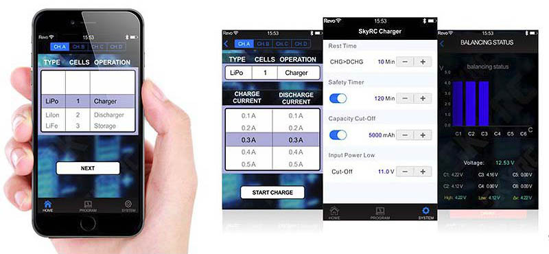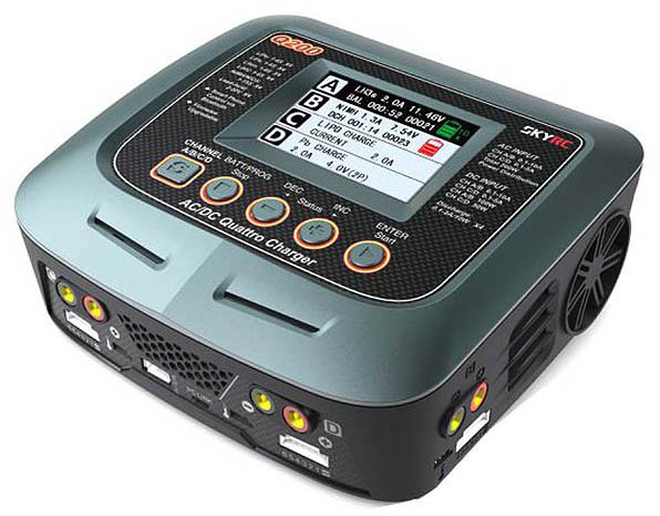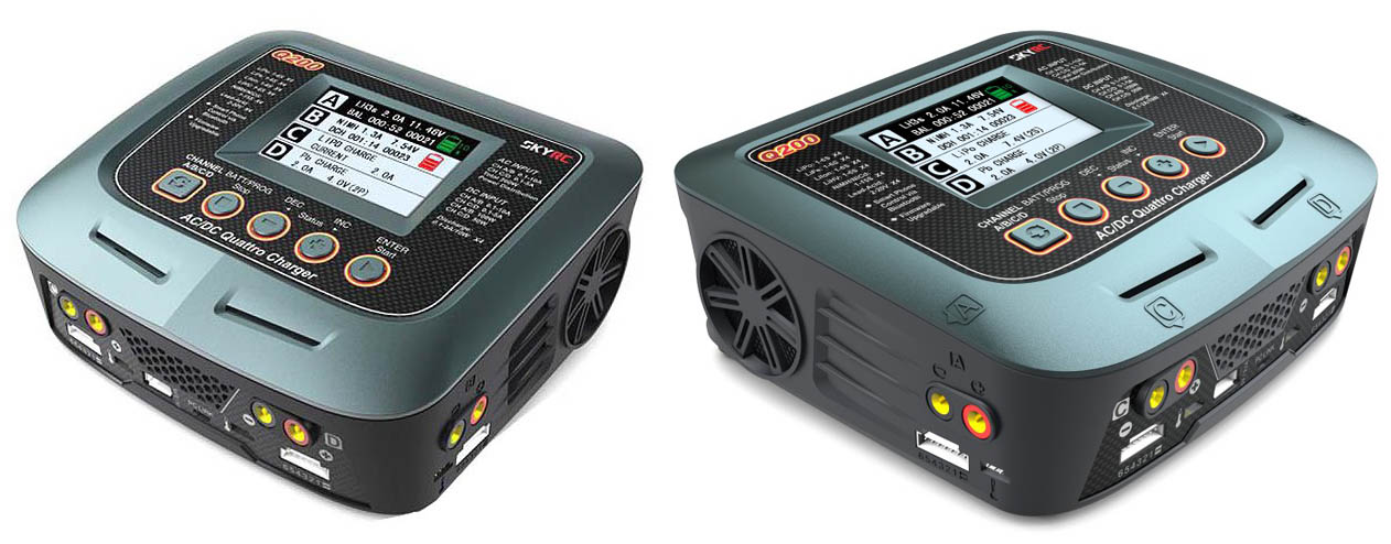 Wanneer men electrische vliegtuigen, auto's of boten of zelfs drones bestuurt, houdt men er niet van om te wachten tot de accu's opgeladen zijn. Met de Q200 van SkyRC, kunt u simultaan 4 packs laden en zo uw volgende bestuursessie vlugger klaarmaken en zelfs op het terrein uw packs laden terwijl u nog volop in actie bent.