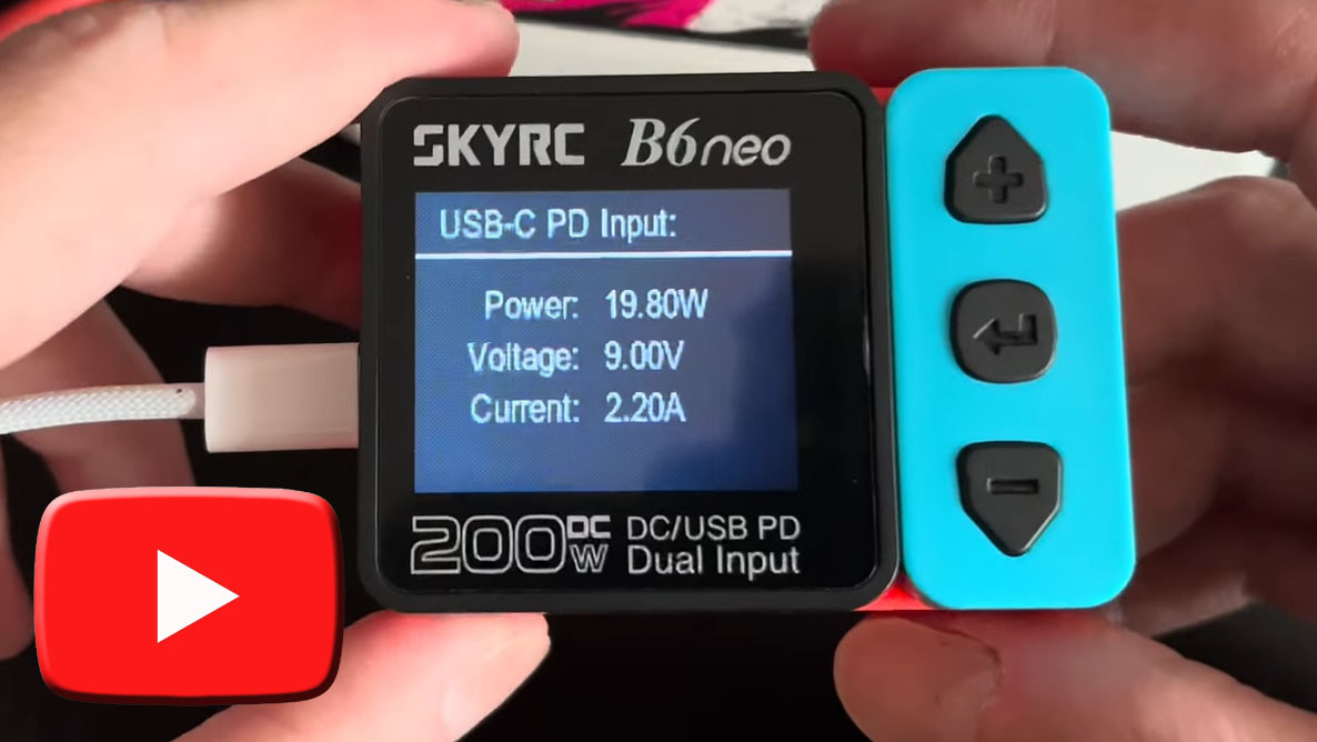 In slechts tien minuten beschrijft Arthur de ongelooflijke mogelijkheden van deze kleine lader, die conventioneel kan worden gevoed met gelijkstroom (10 tot 28 V) uit een werkplaatsvoeding of zelfs een groot Lipo-pakket (tot 200 watt), maar ook via een USB-C-connector (tot 80 watt)!